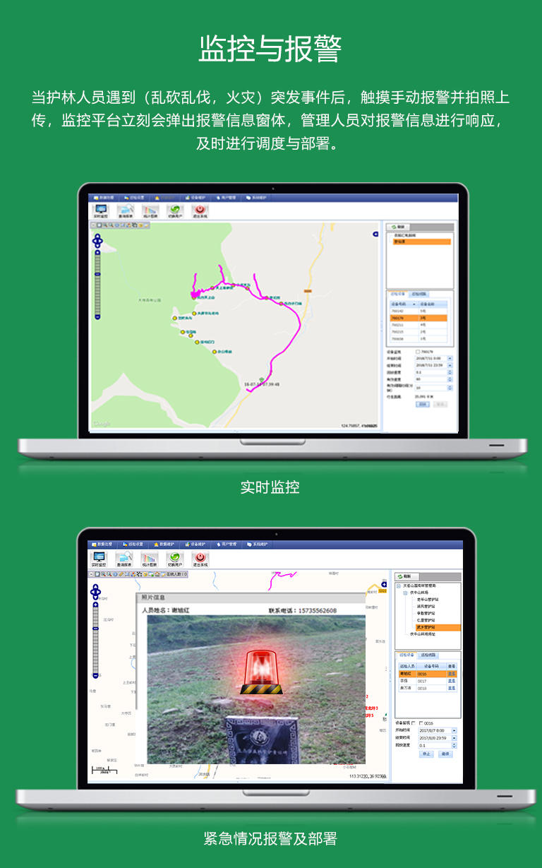 當護林人員遇到(亂砍亂伐,火災)突發事件后,觸摸手動報警并拍照上傳,監控平臺立刻彈出報警信息窗體,