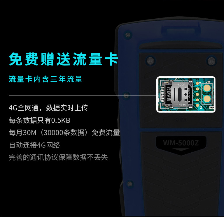 4G全網(wǎng)通,數(shù)據(jù)實時上傳每條數(shù)據(jù)只有0.5KB每月30M(30000條數(shù)據(jù))免費流量自動連接4G網(wǎng)絡(luò)完善的通訊協(xié)議保障數(shù)據(jù)不丟失