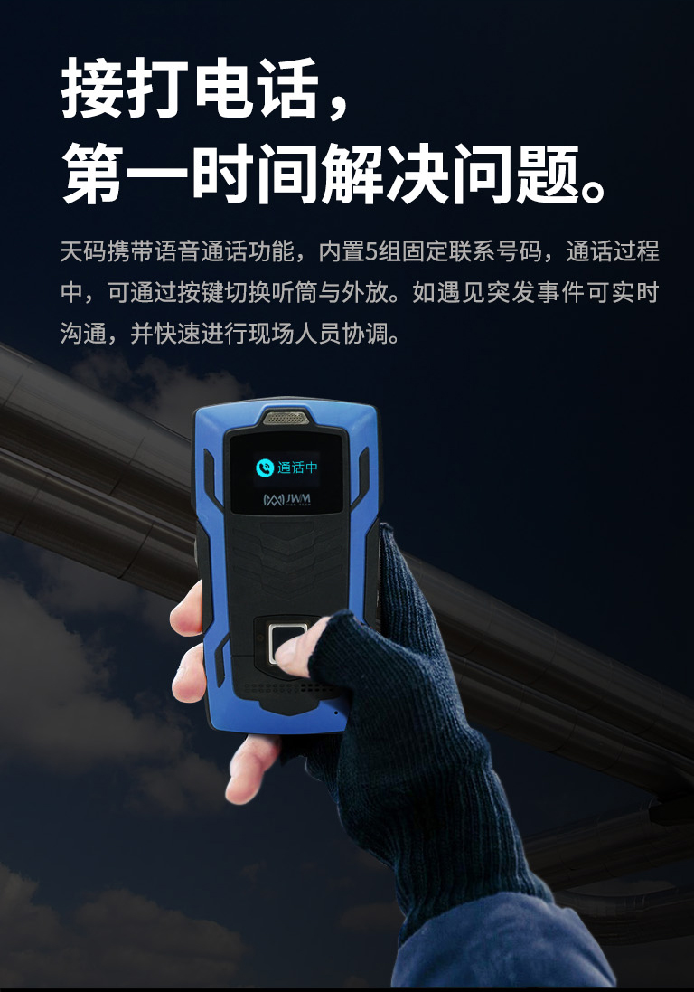 天碼攜帶語音通話功能,內(nèi)存5組固定聯(lián)系號碼,通話過程中,可通過按鍵切換聽筒與外放。如遇見突發(fā)事件可實時溝通,并快速進行現(xiàn)場人員協(xié)調(diào)。